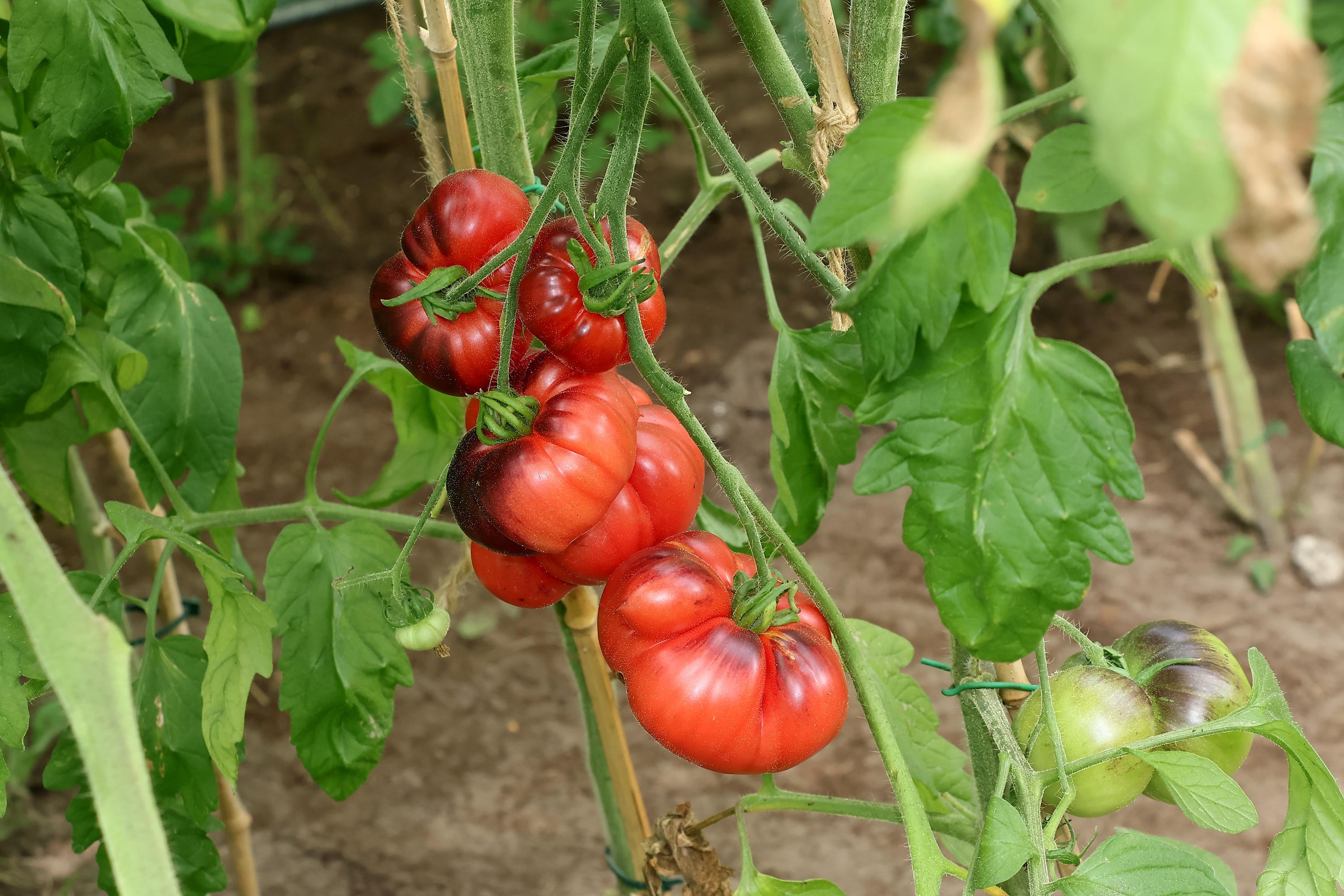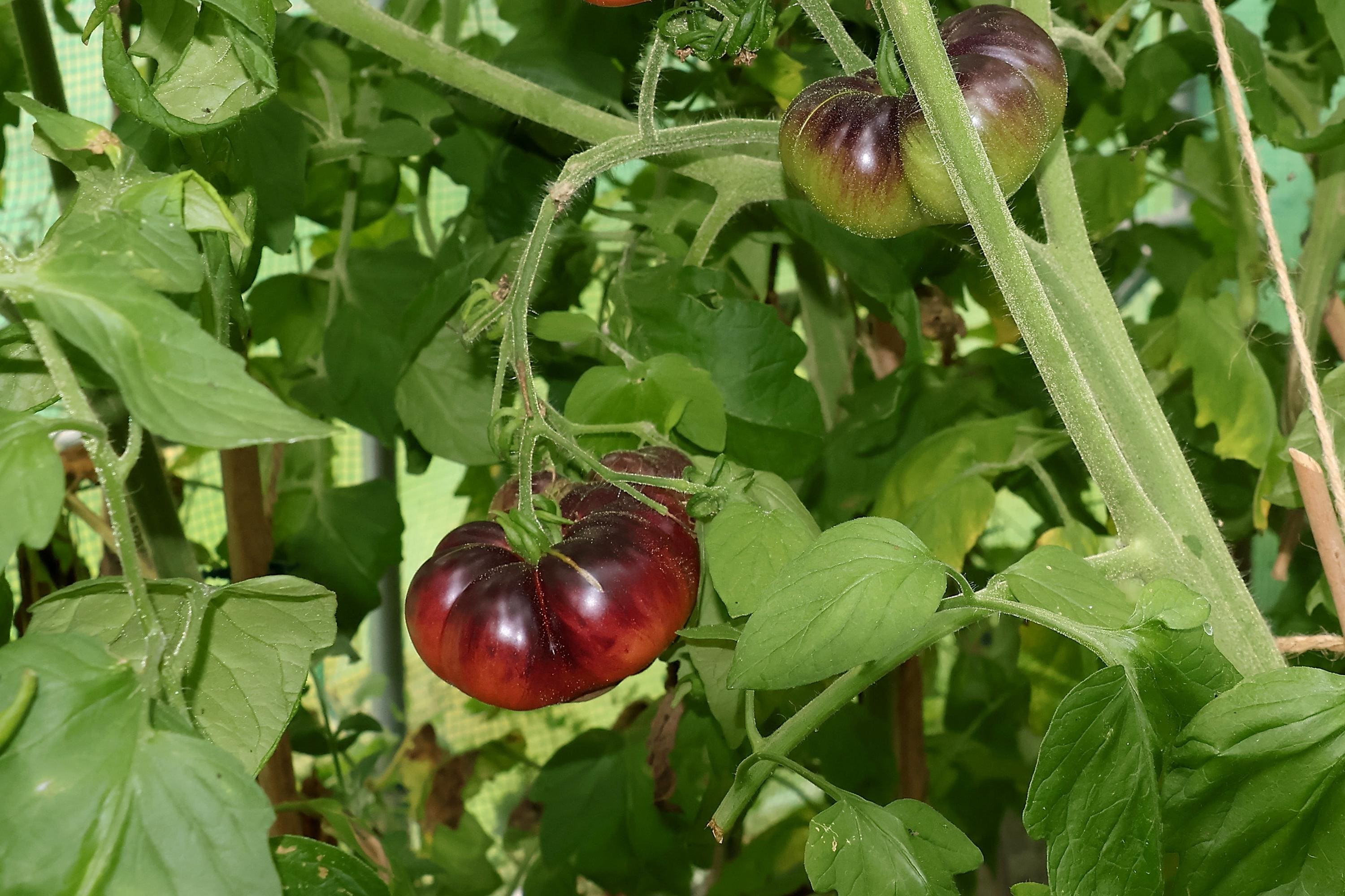 The Indigo Blue tomato is ready to harvest when the underside turns deep red while the top remains dark purple to nearly black.