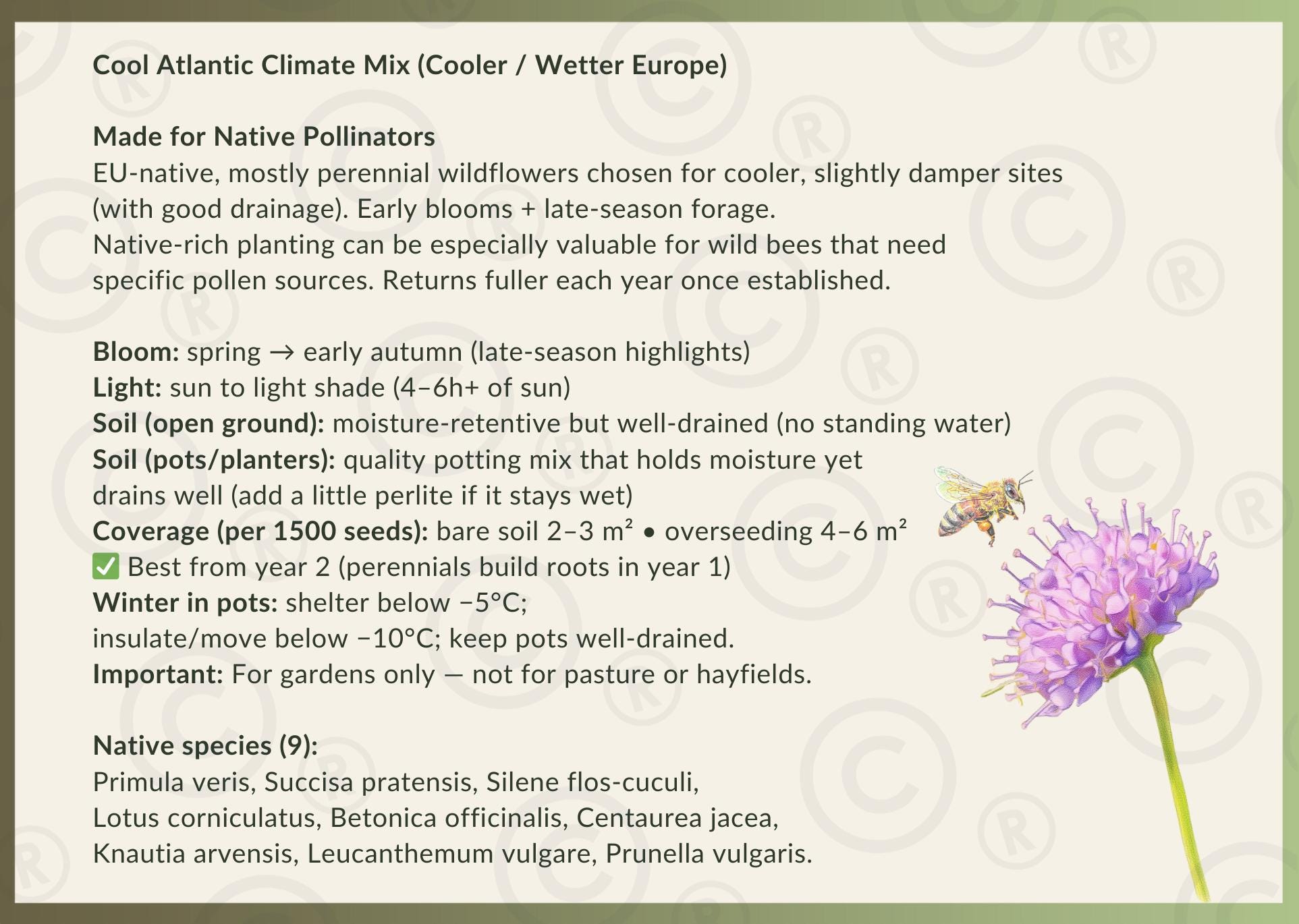 Unlike many “bee mixes” built around fast annuals and non-native flowers, this blend contains only EU-native, mostly perennial wildflowers chosen for cooler sites that stay a little moist (but never waterlogged). With early-season blooms + late-season forage, it creates a long flowering arc — and once established, it returns fuller and richer each year.