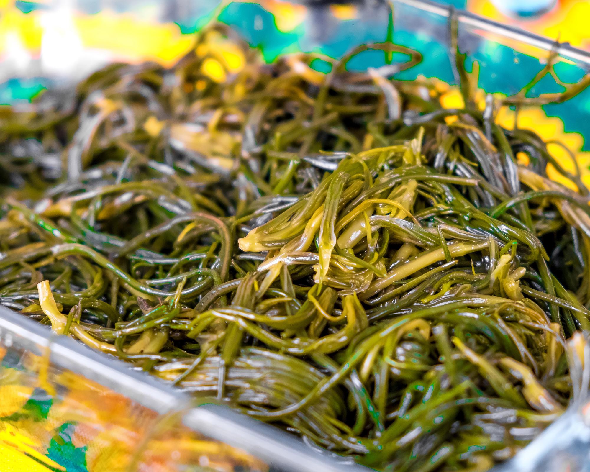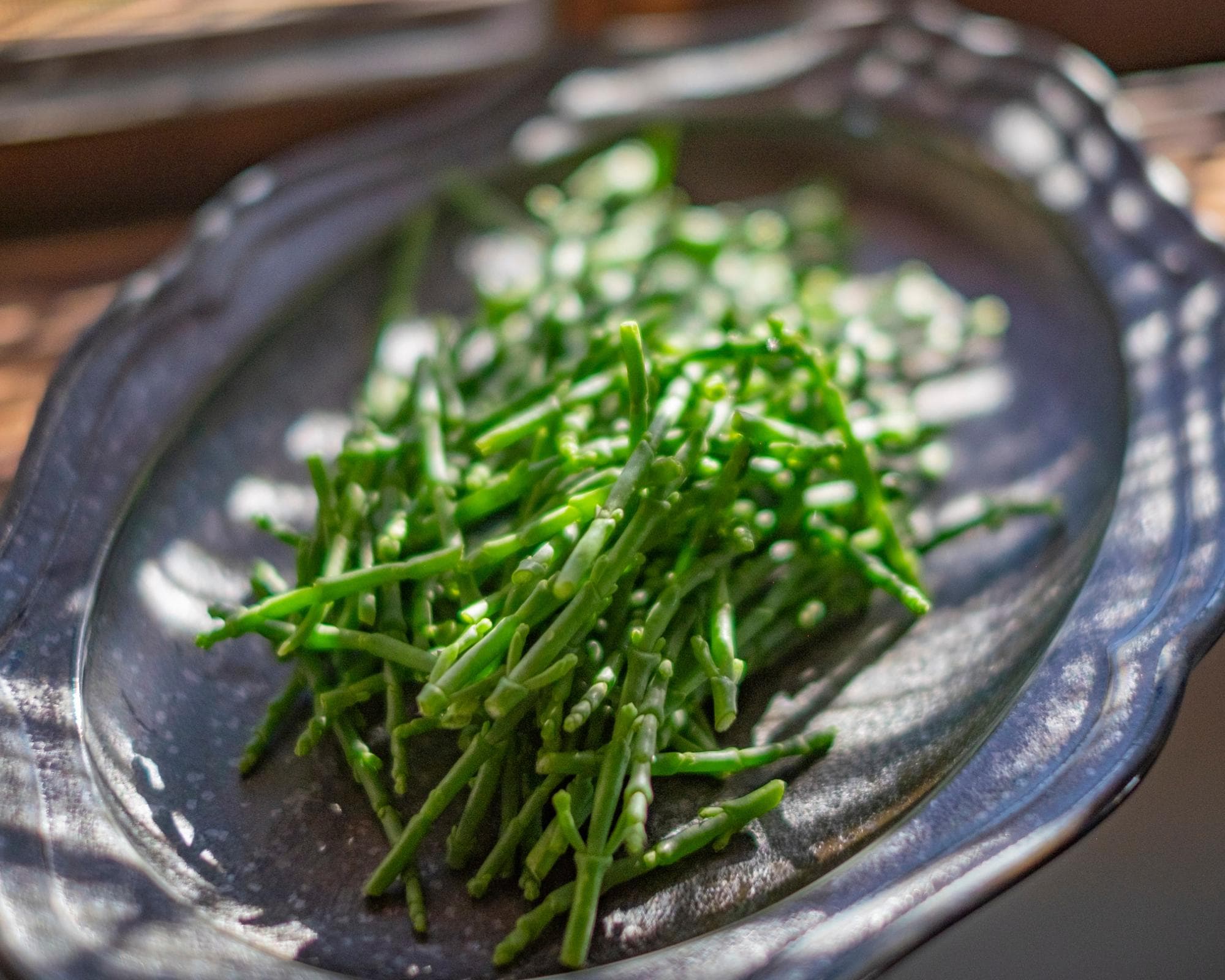 Agretti (also "barba di frate") is an Italian leafy vegetable with thin, juicy shoots—delicious when cooked briefly and then seasoned with olive oil and lemon.